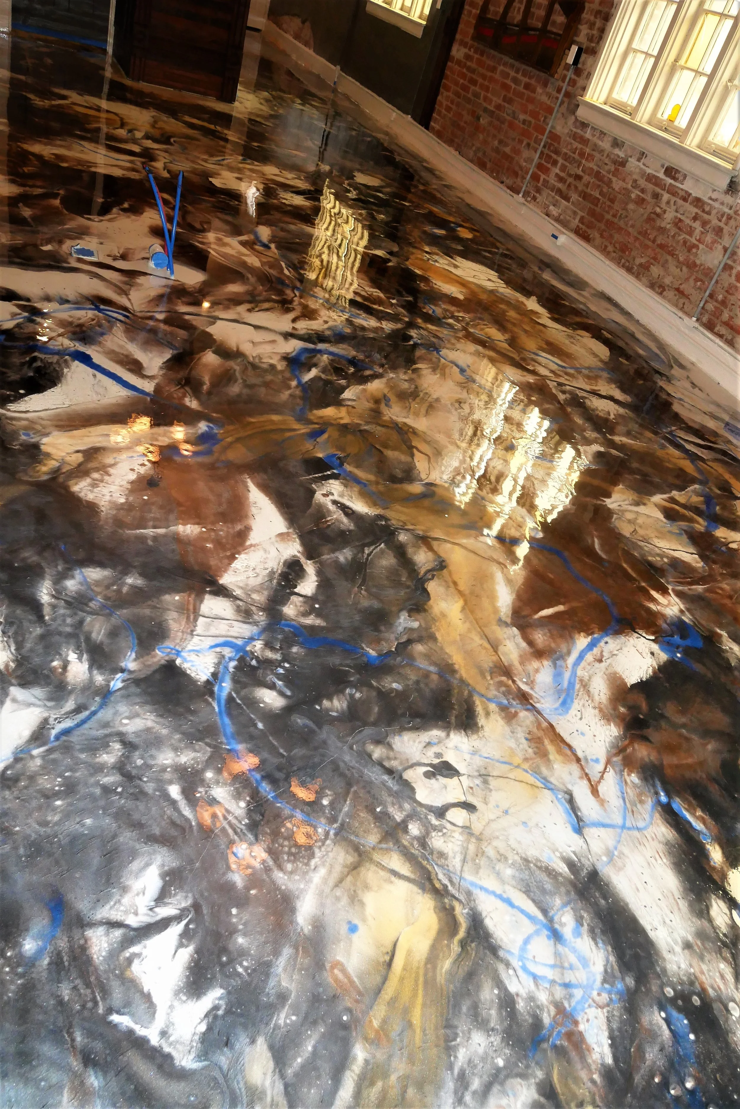 Our creativity truly soared on this commission. There is so much depth and richness to this uniquely poured resin floor. The colors pop out and create a different design each step you take on this 700 sqft. canvas! …..I happen to think it looks like an Ice Cream Dream!