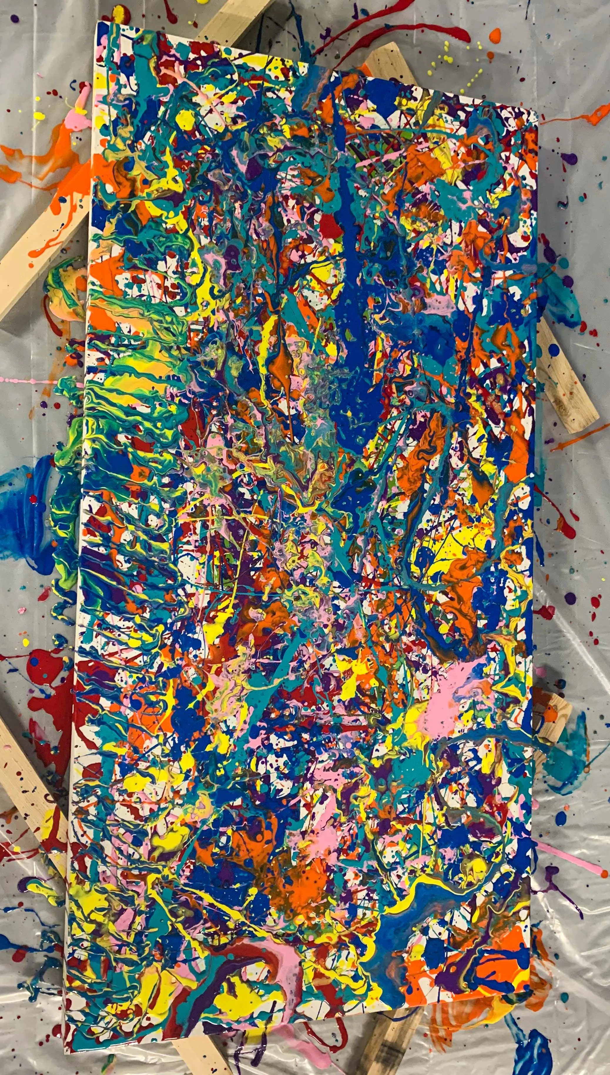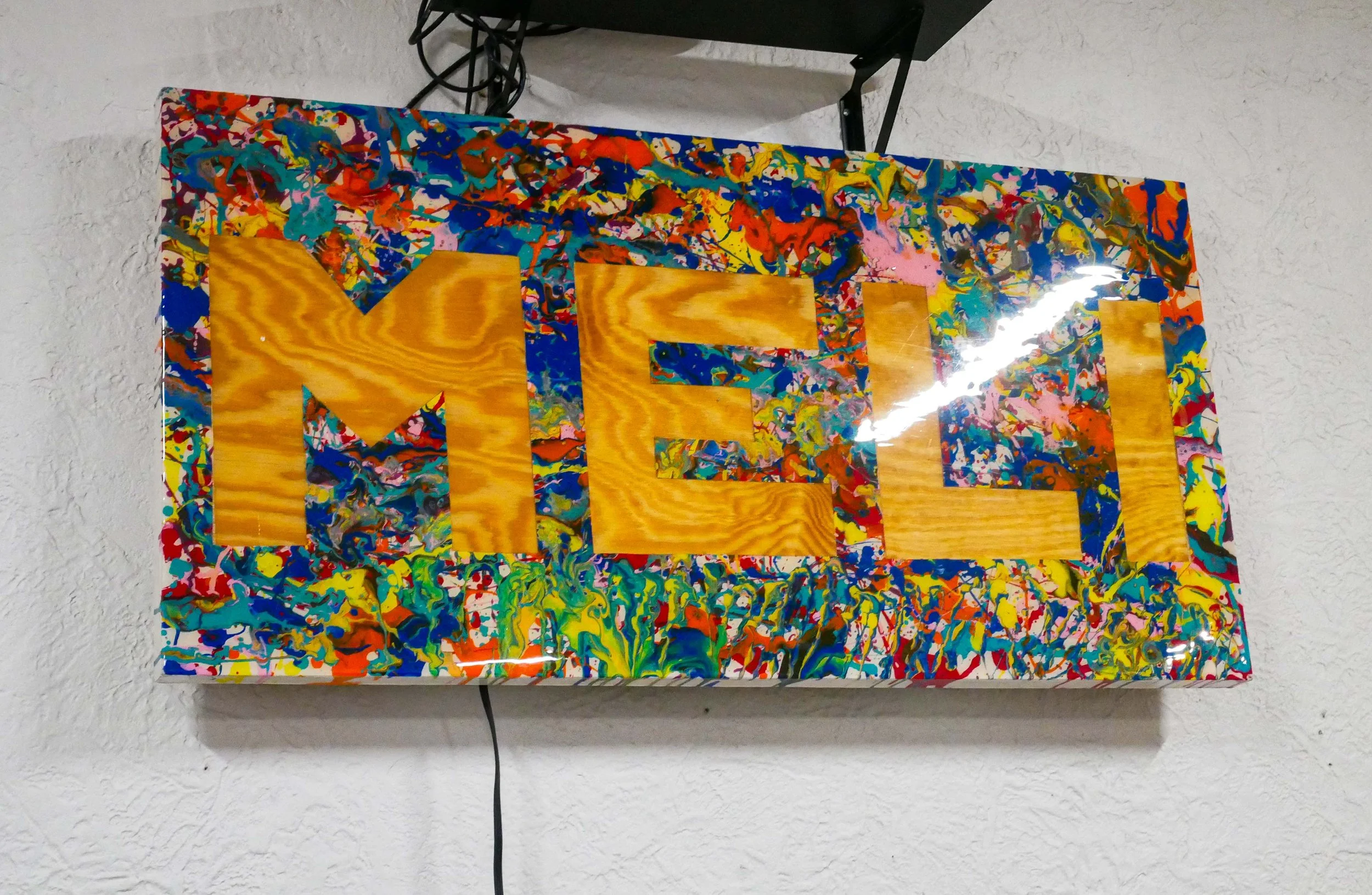 We partnered with MELI First Friday to create a community pour painting artwork. The guest at the event were allowed to pick a color of choice and pour their own cup of paint on the wood canvas to create a beautiful background highlighting the fashion brand MELI.
