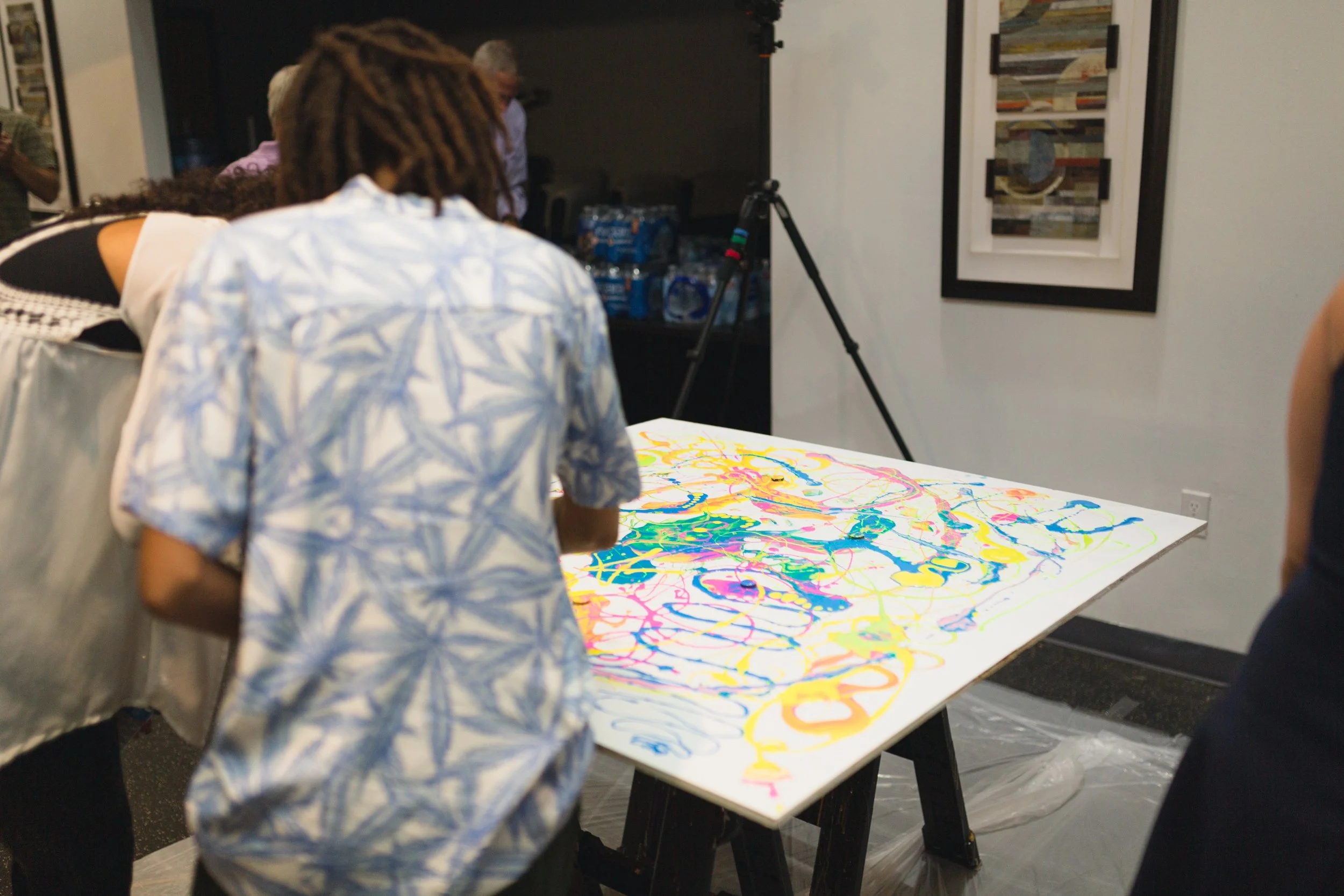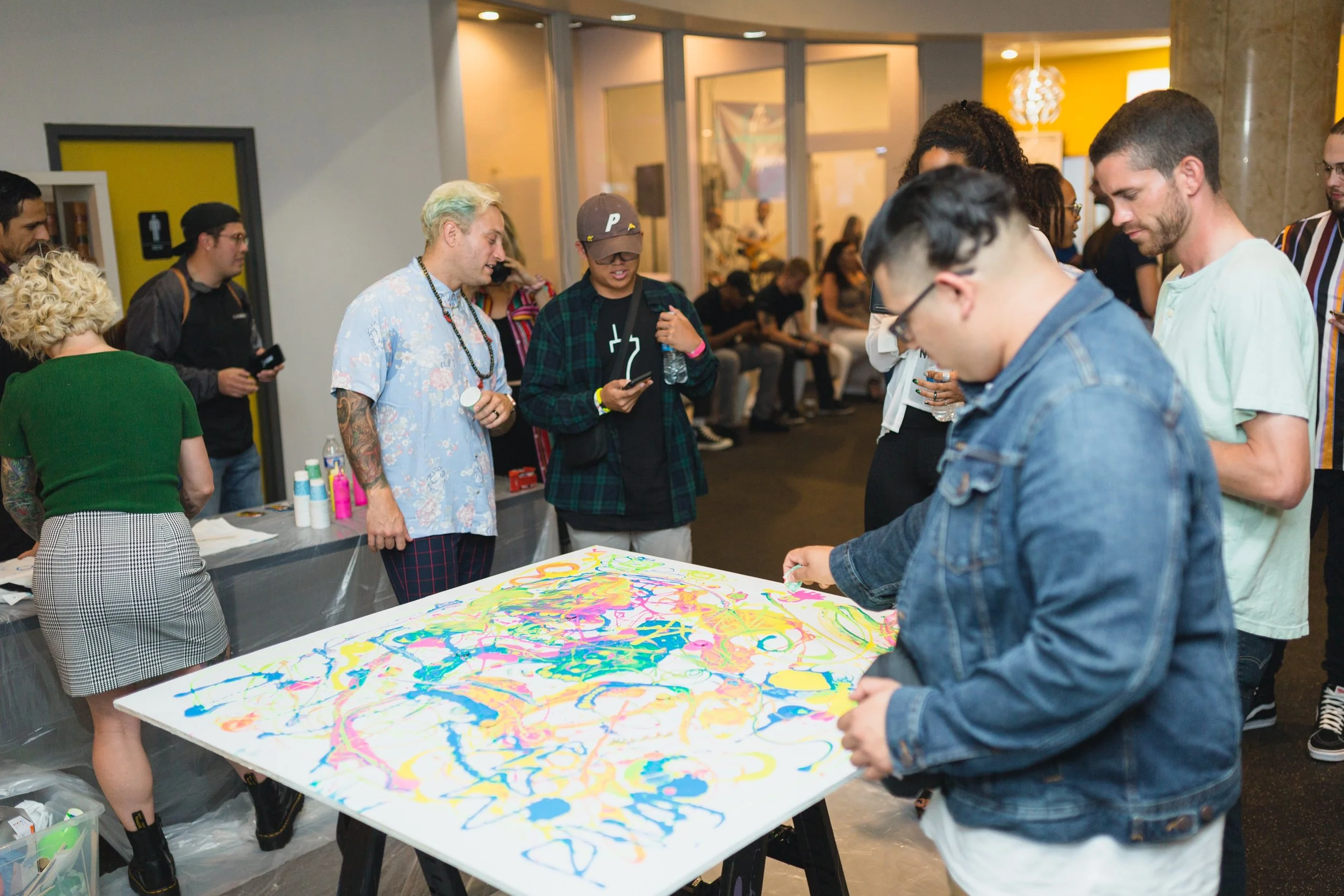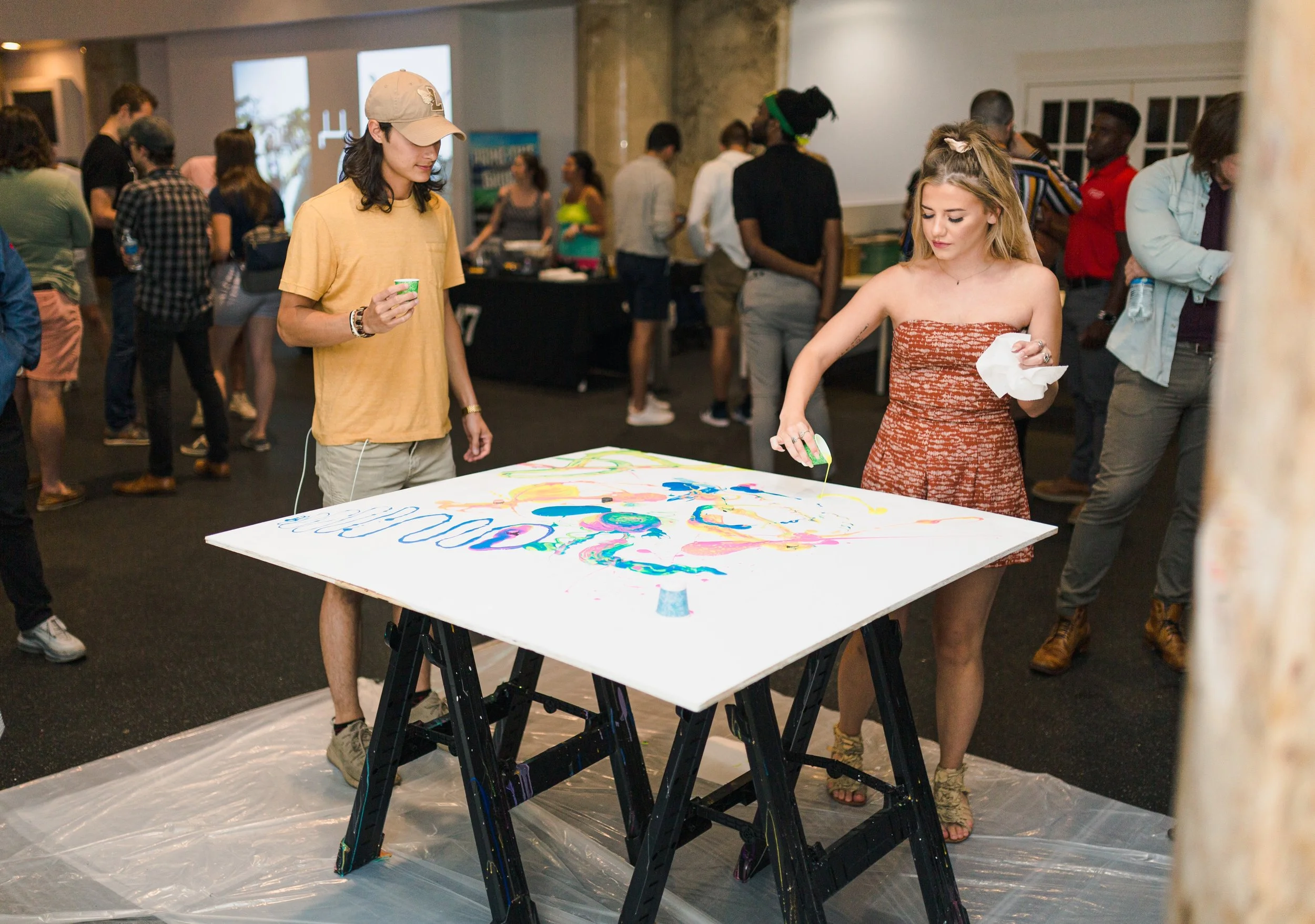 We brought the art, they brought the party! Join PLUG asked us to bring an art experience everyone could participate in. Each person at the party was allowed to splatter paint onto the piece, creating one large beautiful piece of art.