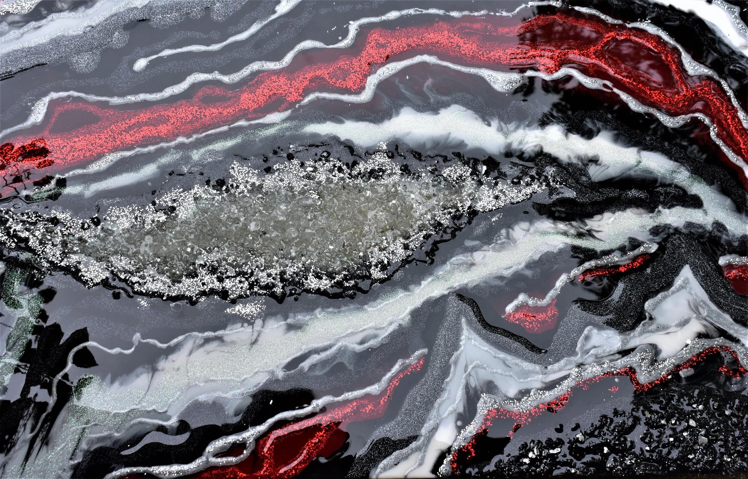 Medium: Epoxy resin, crystal quartz, mixed media on wood board.