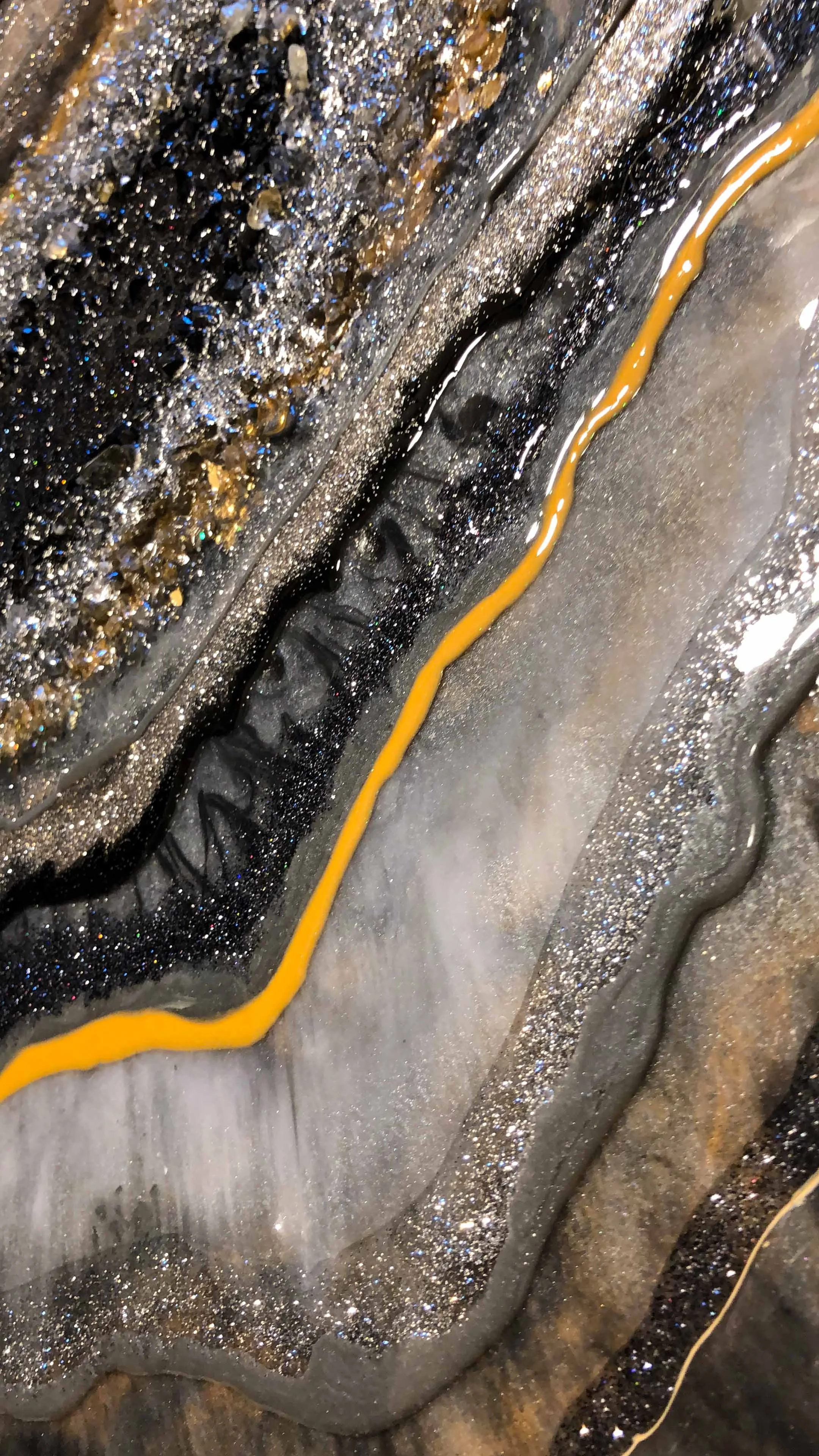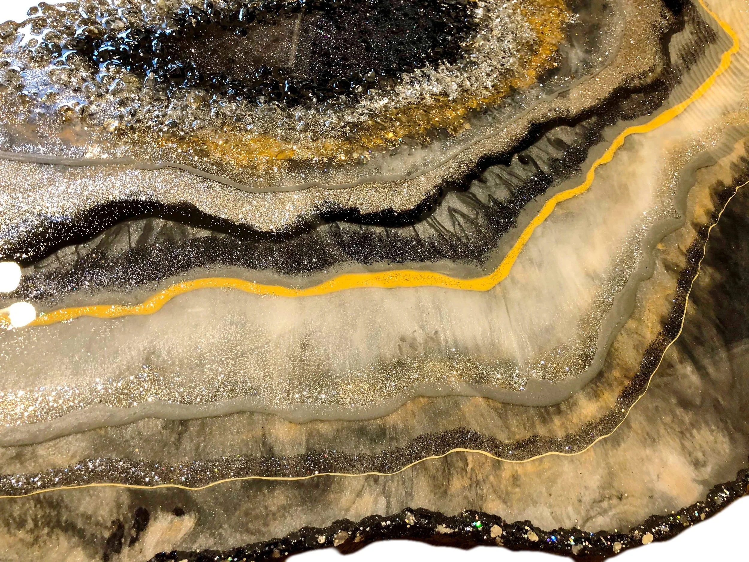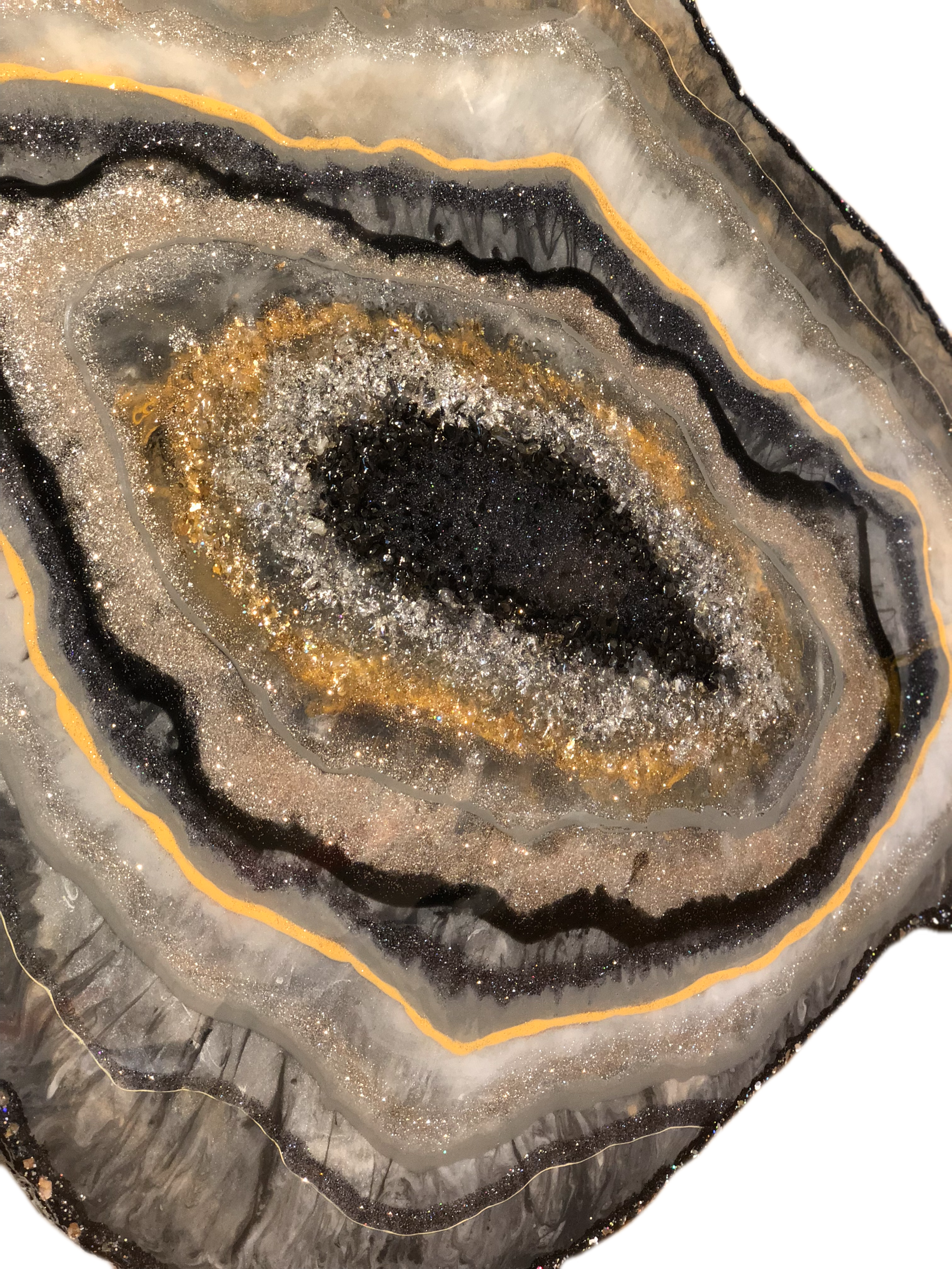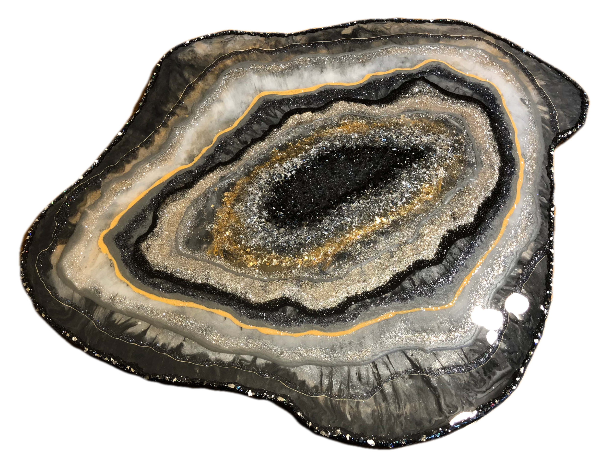 This original piece was commissioned from a client in Texas. Therefore giving its name, Texas Geode. She wanted a hint of orange among the gray, black, & silver tones. The champagne and silver glitter settle in lovely among the depths of this piece.